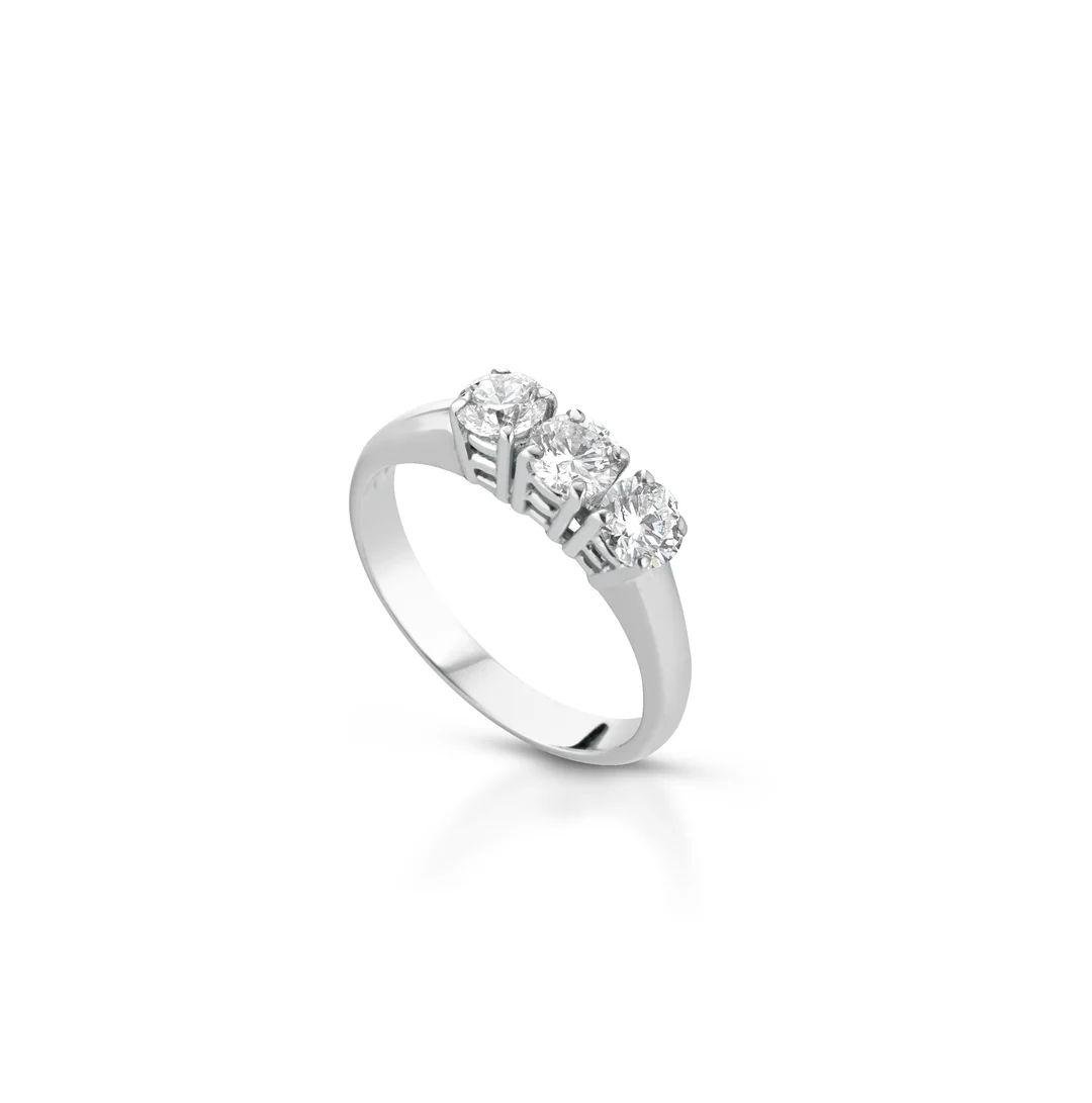 Anello trilogy in argento 925 con tre zirconi taglio brillante incastonati a griffe su montatura elegante. Finitura lucida e design raffinato, simbolo di passato, presente e futuro.