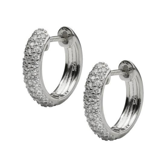 Orecchini a cerchio in argento 925 rodiato con doppia fila di zirconi bianchi incastonati a pavé. Chiusura a scatto invisibile