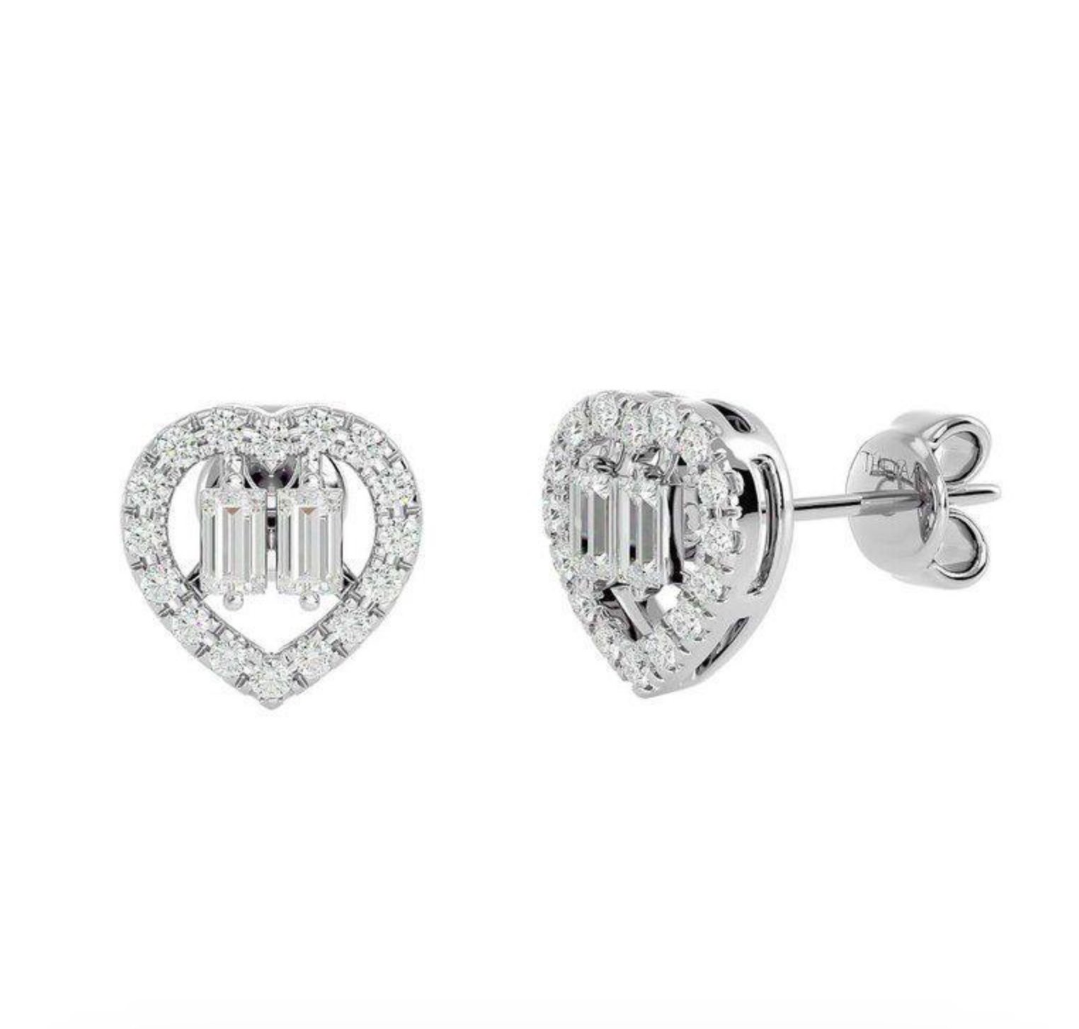 Orecchini a lobo in argento 925 con cuore pavé e zirconi baguette incastonati al centro.