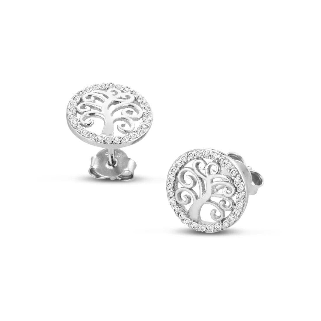 Orecchini in argento 925 con simbolo dell’albero della vita finemente traforato e contorno di zirconi bianchi taglio brillante. Finitura lucida e chiusura a perno con farfallina