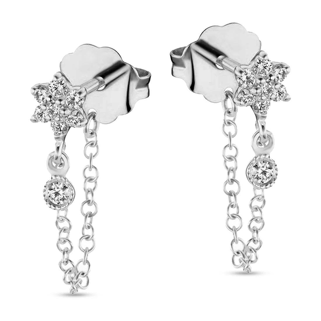 Orecchini in argento 925 rodiato con stelle e zirconi bianchi taglio brillante, arricchiti da doppia catena pendente che dona movimento e luce. Chiusura a perno con farfallina