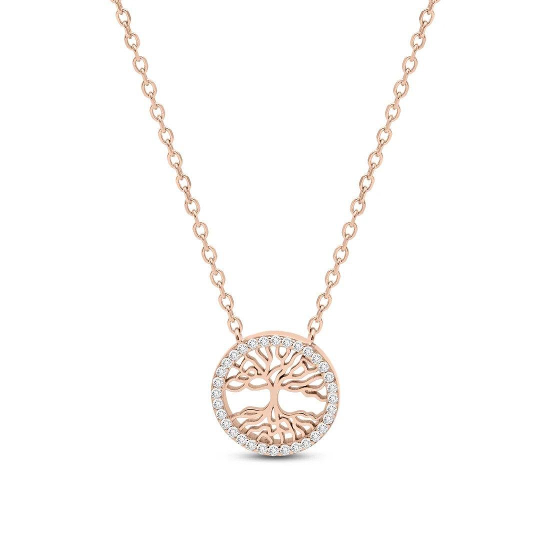 Realizzata in argento 925 con finitura rosé, questa collana presenta un pendente rotondo con il simbolo dell’Albero della Vita, incorniciato da una delicata fila di zirconi bianchi.