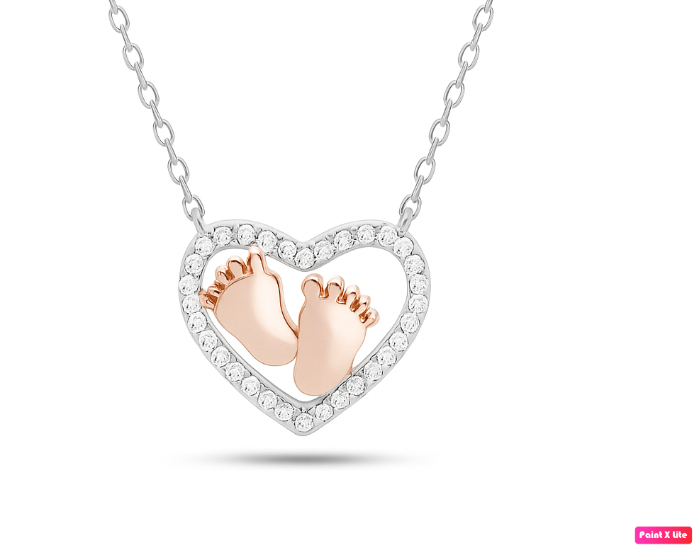Realizzata in argento 925, questa collana presenta un pendente a cuore contornato da zirconi bianchi e impreziosito da due piccoli piedini in finitura rosé
